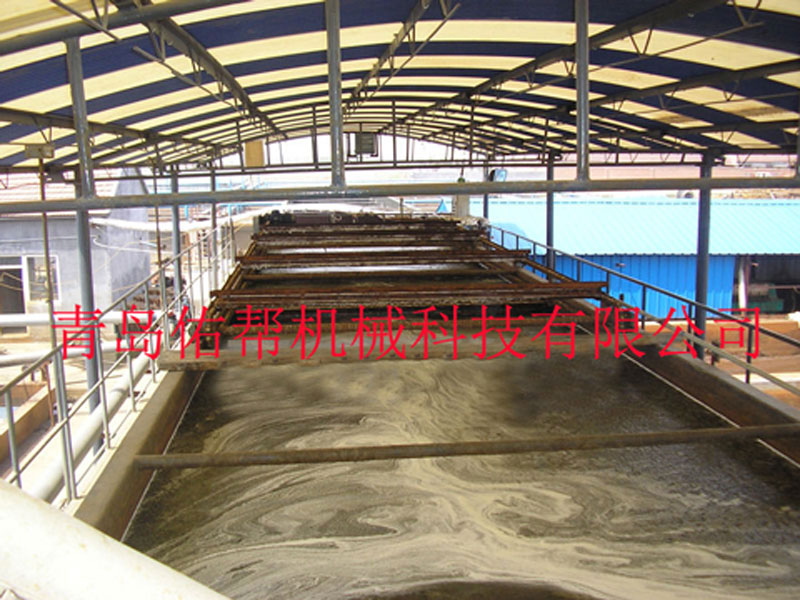 渦凹、溶氣組合式氣浮機(jī)為一體化撬裝設(shè)備,渦凹?xì)飧∠到y(tǒng)和溶氣氣浮系統(tǒng)共用一個(gè)箱體,共用一臺(tái)刮渣機(jī),設(shè)備體積減小,運(yùn)輸、安裝比較方便。進(jìn)水經(jīng)加藥混合后,在渦凹曝氣機(jī)的攪拌和曝氣的作用下,藥劑和污水更成分的混合反應(yīng)并與氣泡粘附,大部分懸浮物漂浮于池體表面,經(jīng)出水堰調(diào)節(jié)水位后,浮渣不需經(jīng)過(guò)刮渣機(jī)可自流進(jìn)排渣槽排出,浮渣含水量低,濃縮效果好。經(jīng)過(guò)渦凹曝氣機(jī)處理后的污水自流進(jìn)溶氣氣浮系統(tǒng),渦凹曝氣機(jī)所不能處理徹底的細(xì)小的絮體和污泥等懸浮物,經(jīng)微小的氣泡捕捉上浮形成密度比較小的浮渣,再有刮渣機(jī)推送到排渣槽排出。處理后的水經(jīng)過(guò)出水堰溢流出設(shè)備外。